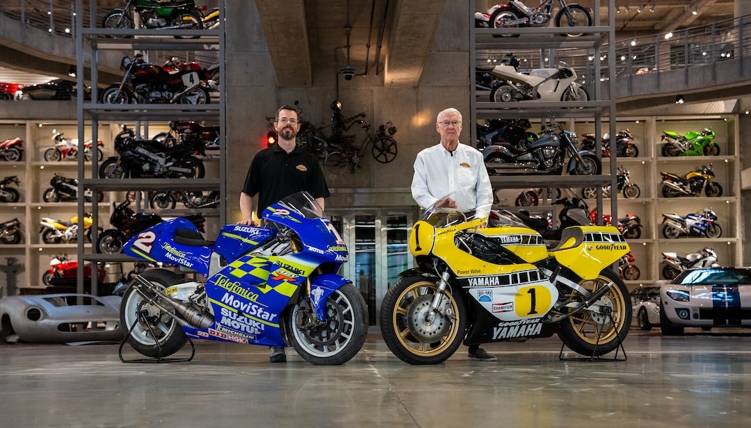 This is my favorite photo of George Barber (right), posing in the museum with Executive Director Brian Case and the Suzuki RGV500 and Yamaha YZR500 raced by Kenny Roberts Jr. and Kenny Roberts.